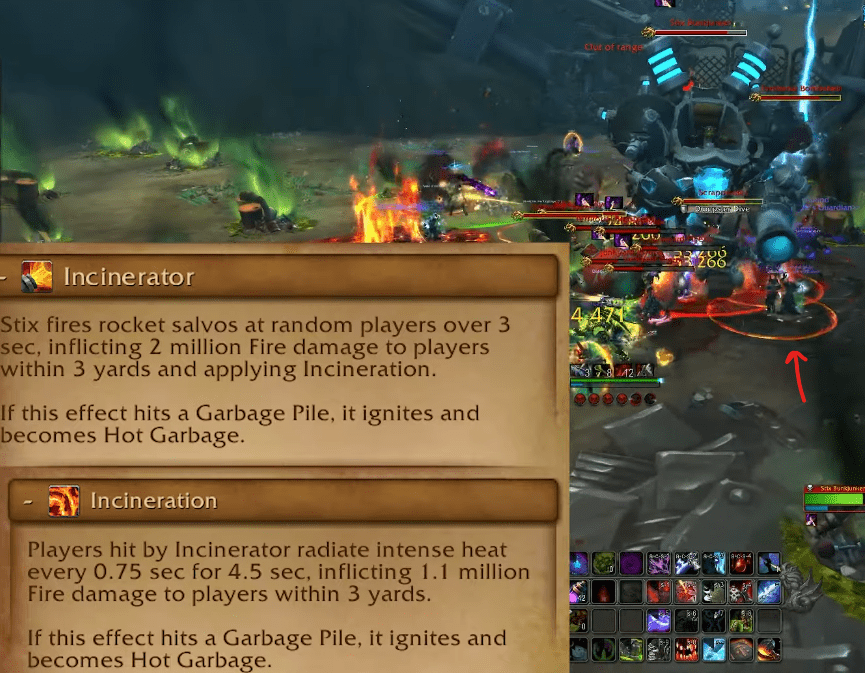 Incinerator – Spieler werden im Verlauf des Kampfes mit einem roten Kreis markiert. Mit diesen sollten man sich ein wenig verteilen und Wichtig: Nicht in der Nähe eines Müllhaufens stehen, da dieser sonst zerstört wird und eine Feuerfläche hinterlässt.